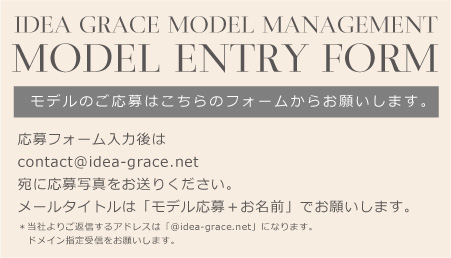 | COPYRIGHT(C) ALL RIGHT RESERVED IDEA GRACE 2013. 大阪・東京・上海の商業写真事務所型広告製作事務所・モデル事務所/モデルマネジメント・モデルキャスティングオフィス IDEA GRACE MODEL MANAGEMENT -イデアグラスモデルマネジメント- | (代表)06-6915-6910 |